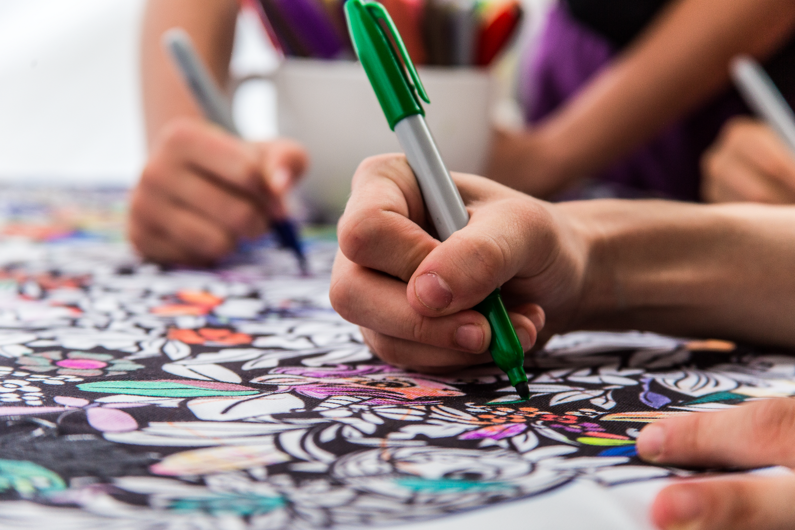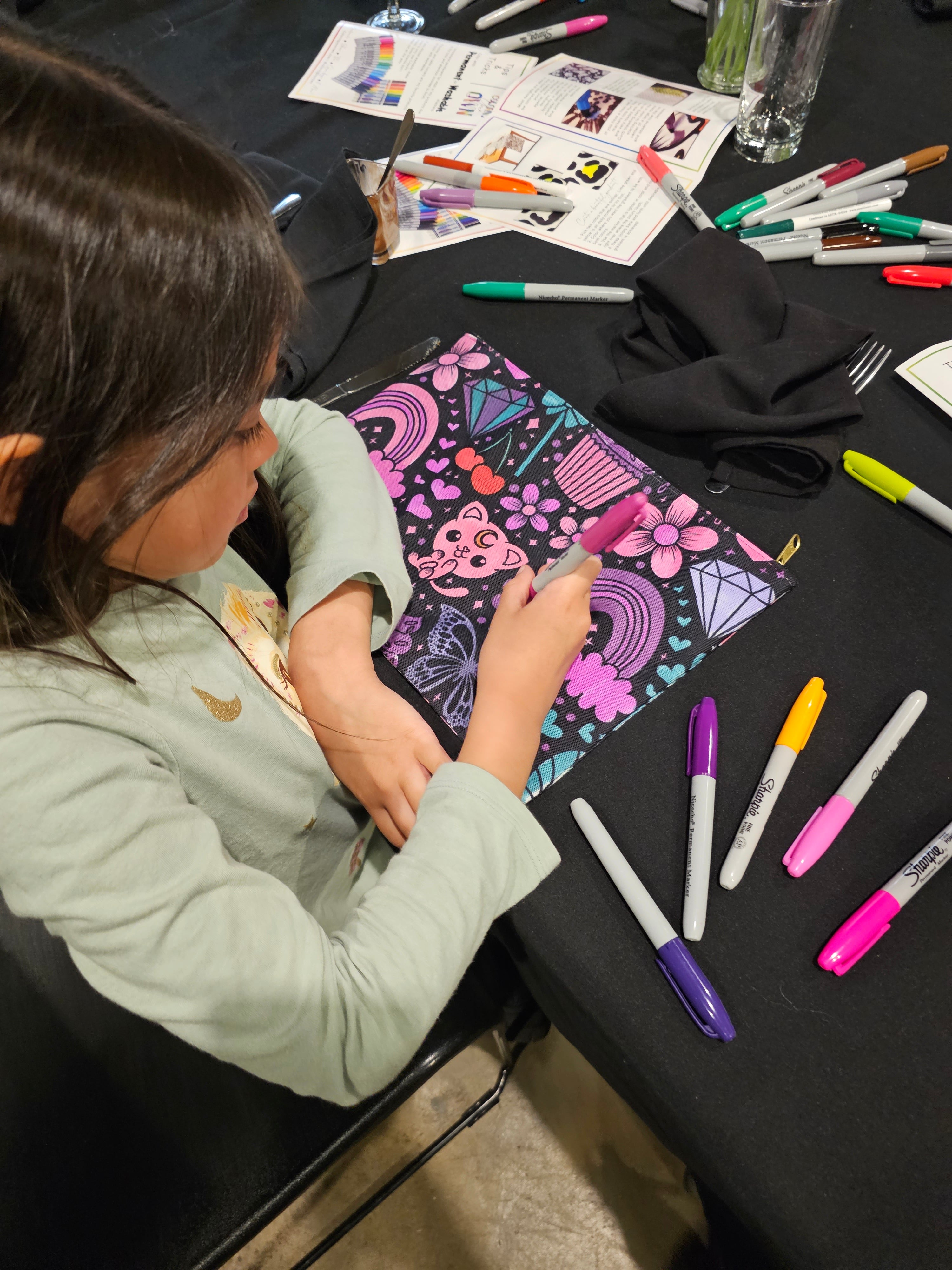 Our signature products feature original line art printed on fabric you can color in with permanent markers, making each item a personal masterpiece.